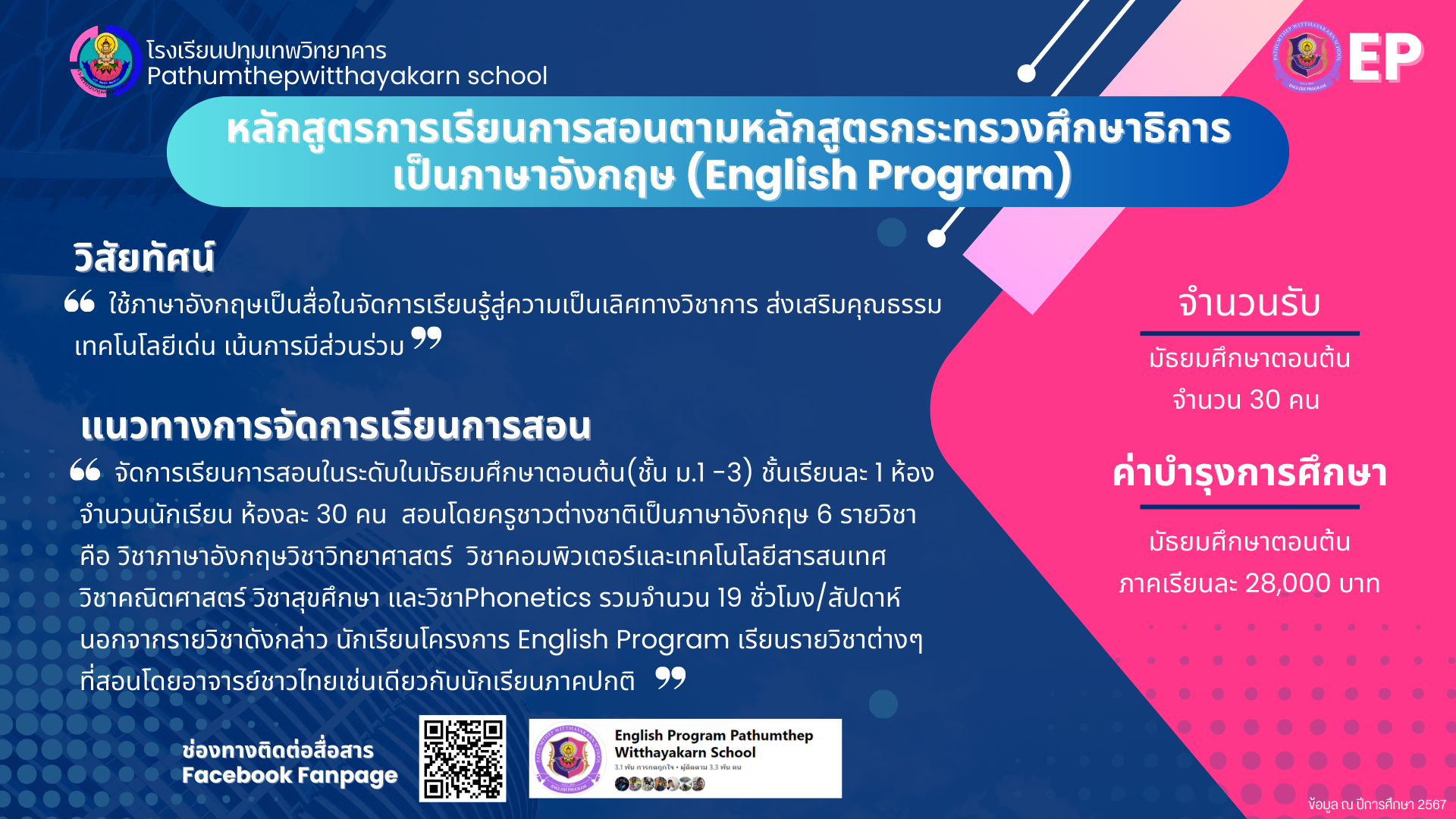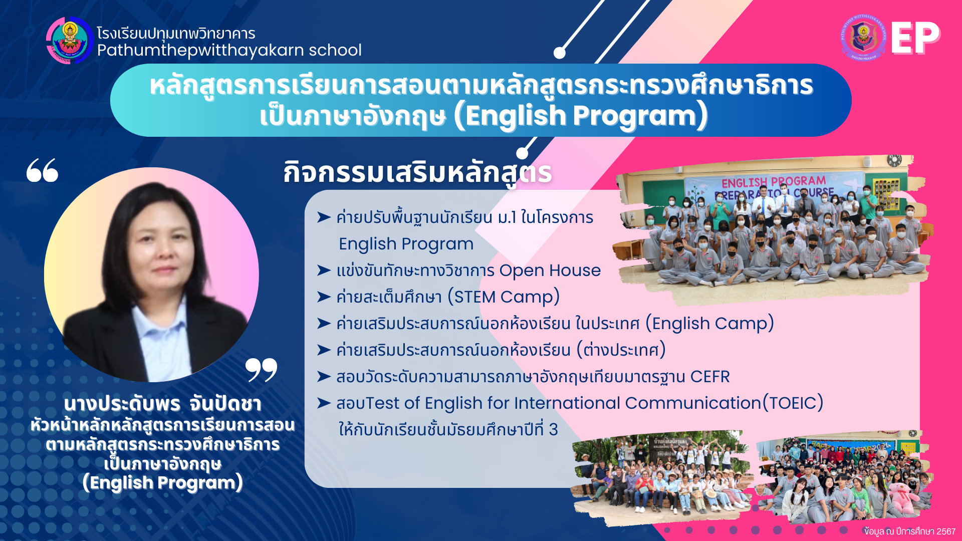 หลักสูตรการเรียนการสอนตามหลักสูตรกระทรวงศึกษาธิการ เป็นภาษาอังกฤษ (English Program : EP)